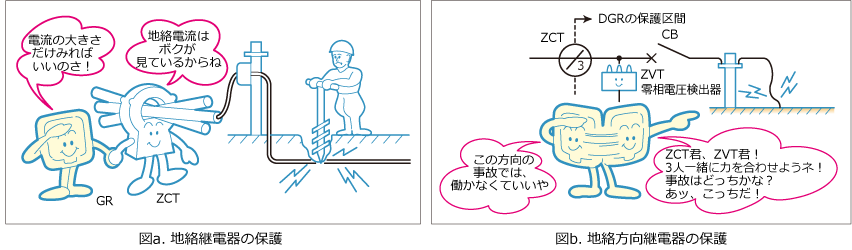 ②地絡方向継電器(DGR:Directional Ground Relay)も、地絡故障を検出して保護するものですが、地絡事故時に