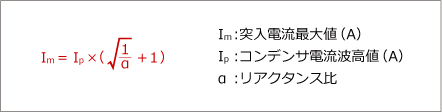 コンデンサの開閉には、一般負荷の開閉と比較してコンデンサを投入する際、非常に大きな突入電流(数十倍~数百倍)が流れる特性があります。この突入電流を抑制するために、並列コンデンサ群をもつコンデンサ回路や多頻度コンデンサ回路に直列リアクトルの設置が効果的です。直列リアクトルを設置した場合の突入電流の大きさは、概略値として以下のようになります。