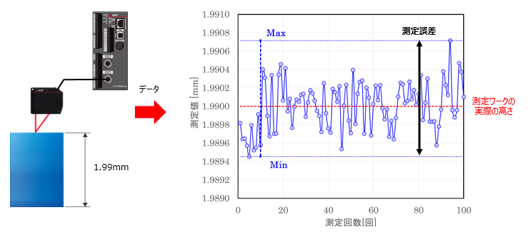 以下のグラフは、測定ワークを複数回測定した結果の一例です。 実際の高さに比べて、測定値がバラついているのがわかります。 このばらつきが精度(測定誤差)です。