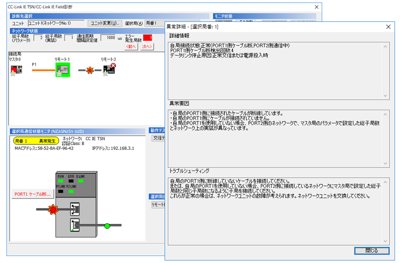CC-Link IE TSN診断は、実際のネットワークの配線と同じようにネットワークの状態を表示するので、 異常箇所が素早くわかり、問題の対処にかかる時間を短くできます。