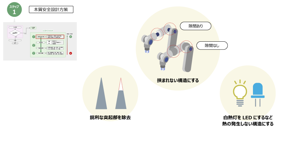 例えば、機械自体の危険源をなくしたり、危険源のエネルギーを下げて危害が小さくなるようにします