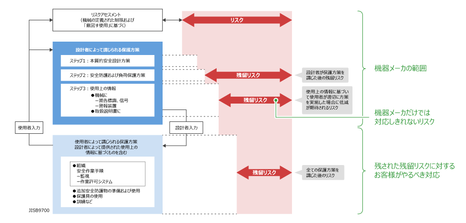 使用者が装置メーカや設計者から受け取った「使用上の情報」に基づいた対策(手順書、保護具、訓練など)を実施する事で、残留リスクを許容できるレベルまで落とし込むことができます。