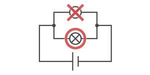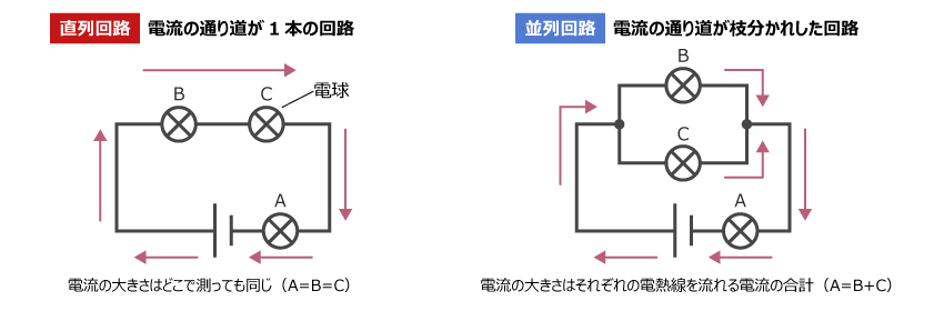 上記の並列回路だと、電球Bが切れても、電球Cは点灯します。1箇所のトラブルで他に影響が及ばないよう、実際の電気配線では、並列回路でつながれていることが多いです。