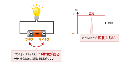直流電気とは、電圧が常に一定で、電流の向きも変化しない電気の流れ方です。