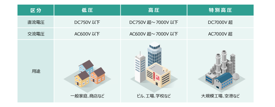 電圧の大きさによって低圧/高圧/特別高圧に区分されます。