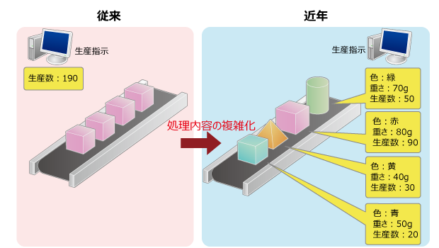 従来、ひとつの製造ラインに対する生産指示は単一の製品のみでしたが、近年は製品の多様化と合理化により、ひとつのラインで複数の製品を作ることが増えています。そのため、処理内容が複雑化しています。