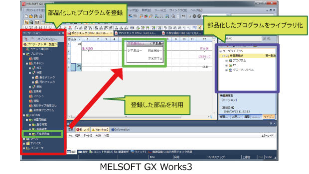 エンジニアリングソフトウェア MELSOFT GX Works3は、構造化プログラミングに対応しています。MELSOFT GX Works3は、プログラム部品を選びやすく表示することによって、再利用しやすくなっています。
