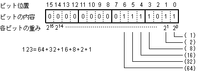 - 数値が格納されたメモリの各ビットは、下位ビットから順に20、21、22、…215の数値の重みを持ちます。
