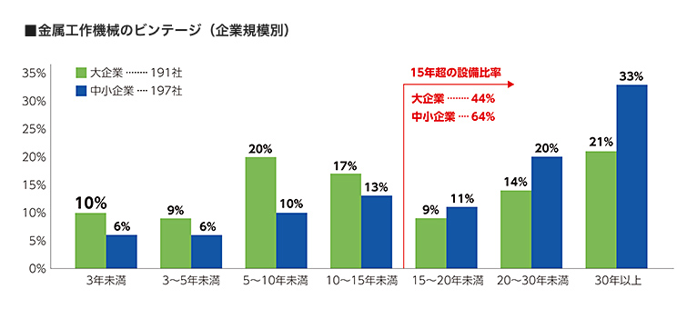 日本機械工業連合会が2019年に行った調査では、国内で導入されている金属工作機械の50%以上が導入から15年以上経過しており、30年以上稼働しているものも25%以上という結果がある。このことからも、保全の重要性が分かる。