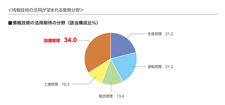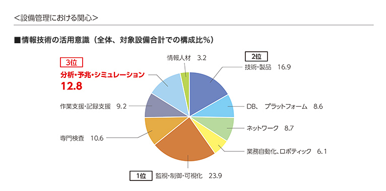 日本プラントメンテナンス協会が2020年に行った調査では、今後IoTやAIなどの情報技術の活用が期待される分野として、30%以上が設備管理となっておりトップに、その活用先として分析・予兆・シミュレーションが3位にランクインしている。