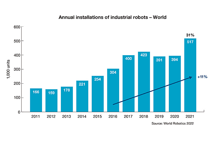 Association for Advancing Automationによると、2020年第3四半期から2021年第3四半期の米国におけるロボット販売全体は32%増加した。国際ロボット連盟によると、2019年と2020年の世界の産業用ロボットの合計売上高にはほとんど変化がなかったが、2022年には急速に増加し、設置されたロボットの数は50万台を超え「過去最高」に達し、年間31%の成長を示すと見ている。