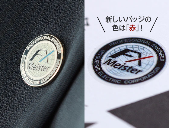 左:第1期生の小川マイスターのバッジのリボンは「青」。