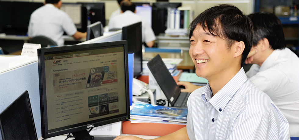 2012年に新卒で入社した同社営業企画部営業企画課の吉田賢司は、入社以来、一貫して三菱電機の製品担当のセールスエンジニア(SE)を務めている。シーケンサからサーボモータ、インバータ、NCまで、ありとあらゆる三菱電機のFA機器を担当するだけに、求められる技術知識は幅広く、日々の勉強が欠かせない。