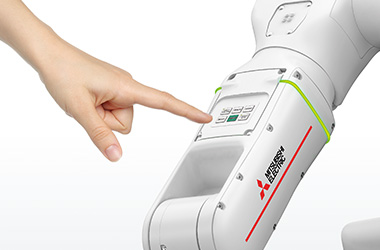 現在のMELFA ASSISTA「ダイレクトティーチング」では、アーム上部にある操作ボタンで簡単に動作指示ができる。