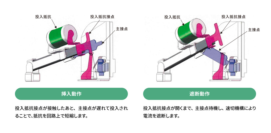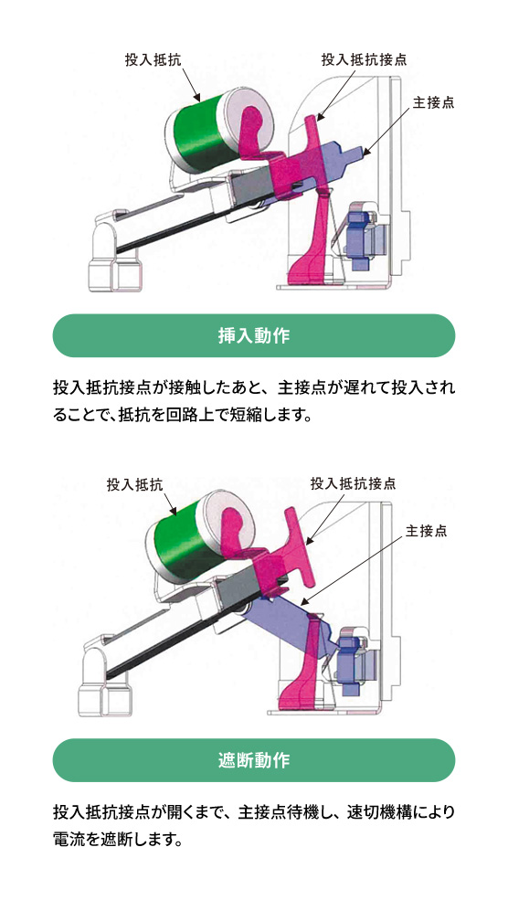 エネセーバの励磁突入電流抑制の仕組み。機械的な接点の動きで抵抗を投入しその後主回路につなぐ