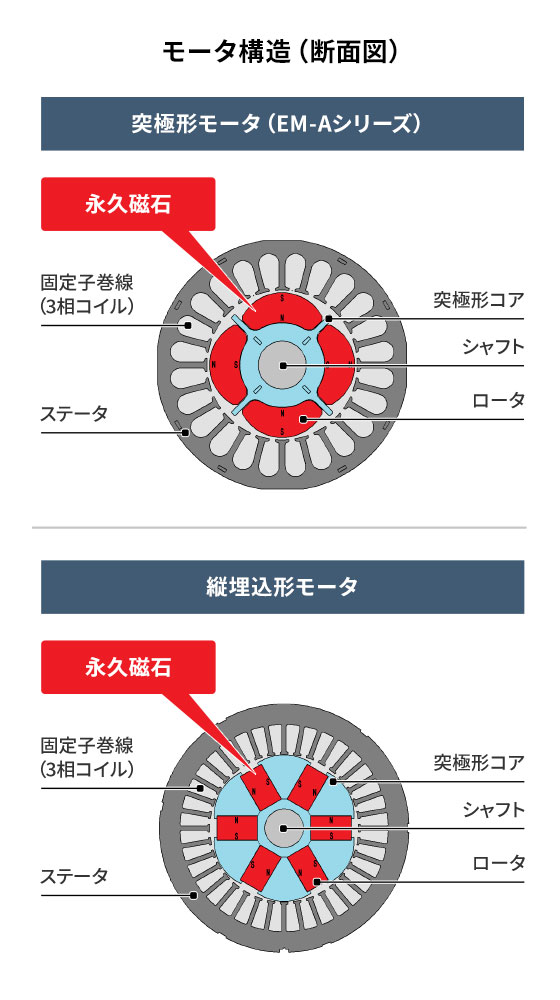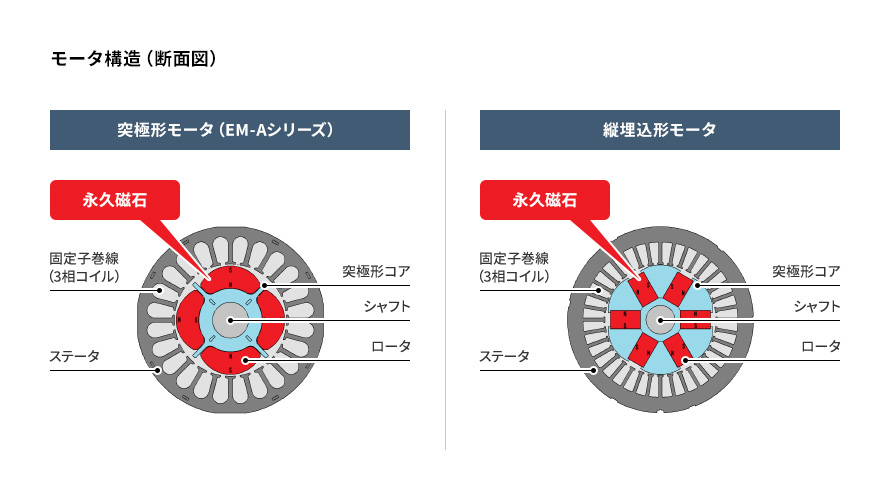 プロジェクト開始から5カ月後の2012年8月、バランスの取れるモータの実現方法は2つの候補に絞られた。突極形と呼ばれるコアを採用したモータと、永久磁石を縦方向に埋め込んだ縦埋込形モータの2つだ。前者の突極形はロータコアに複数の突起を設け、その突起の間を埋めるように永久磁石を貼り付けた構造のモータであり、ロータコアの突起部と磁石部のインダクタンスの違い(突極比)を回転位置の推定に利用する。後者は永久磁石を縦に埋め込むことで磁石の表面積を増やし、大きな磁力を確保するするとともにロータコアと磁石部のインダクタンスの違い(突極比)を回転位置の推定に利用する手法だ。2つのモータに共通するコンセプトは、モータの磁石にレアアースを含有した高性能磁石ではなく、入手性が良く安価なフェライト磁石を使用することであった。