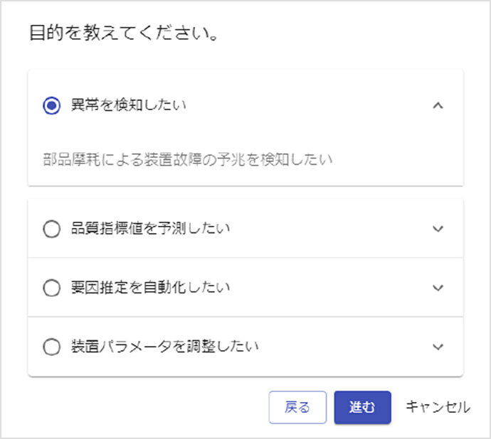 この対話形式での選択方法ではデータ分析やITの専門用語を使わないことを意識したという。「目的を教えてください」「データセットに異常値は含まれていますか」など、平易な質問に答えるだけでデータ分析に不慣れな利用者でも正しく設定できる仕組みになっている。「製造現場の生産技術者などが分かる言葉で質問を設定しているところがポイントです。製造現場を知り尽くしている三菱電機だからできることです」と江口は胸を張る。