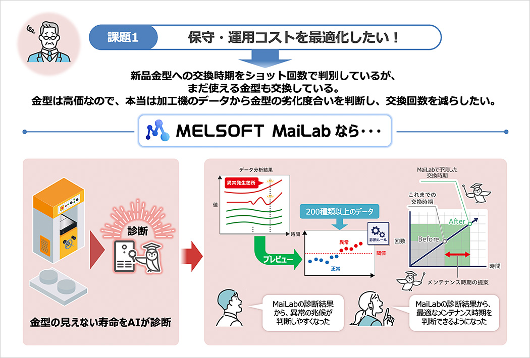 MaiLabを活用することで、人の目で見つけることが難しい異常の兆候を診断する仕組みを簡単に構築できる。モータの振動や電流値、圧力、周囲温度など装置に関わる複数のパラメータから金型の状態を数値化し、正常稼働時のデータと比較することで異常の兆候を監視して故障前の交換やメンテナンス時期を警告するのだ。最初からしきい値を決めるのではなく、状態を見ながら適切な交換時期を提案することで保守や運用に関わるコストを最適化する。こうした仕組みを、先述したように「質問に答える」だけで構築できる。