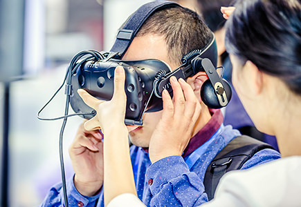 VRでフォトフレーム個性化オーダー生産ラインを体験する来場者