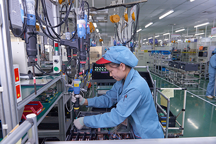 MDIでは小規模な投資から始められる智能製造の一つとして、ねじ締め作業支援システムを見学者向けに公開しています。インバータの生産ラインでのねじ締め工程で、使用する部品や工具、作業手順をラインについた作業者が間違えることのないように、組み立てる製品に合わせた部品選択や作業指示を行うシステムです。締め付け後の良否判定や、締め付けに要した時間の情報収集なども自動化しており、それら情報をもとにした効率的な教育プログラムの企画も可能です。