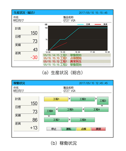 製造ライン・装置の生産状況、稼働状況把握に適した複数の画面をアンドン用テンプレート画面として提供する(図3)。