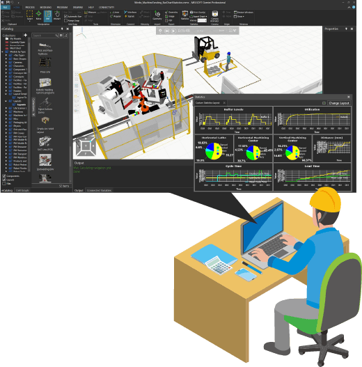 - シミュレーション結果を視覚化・分析して 、 ボトルネックや稼働率の変化を確認でき 、 生産性を検証 できます。