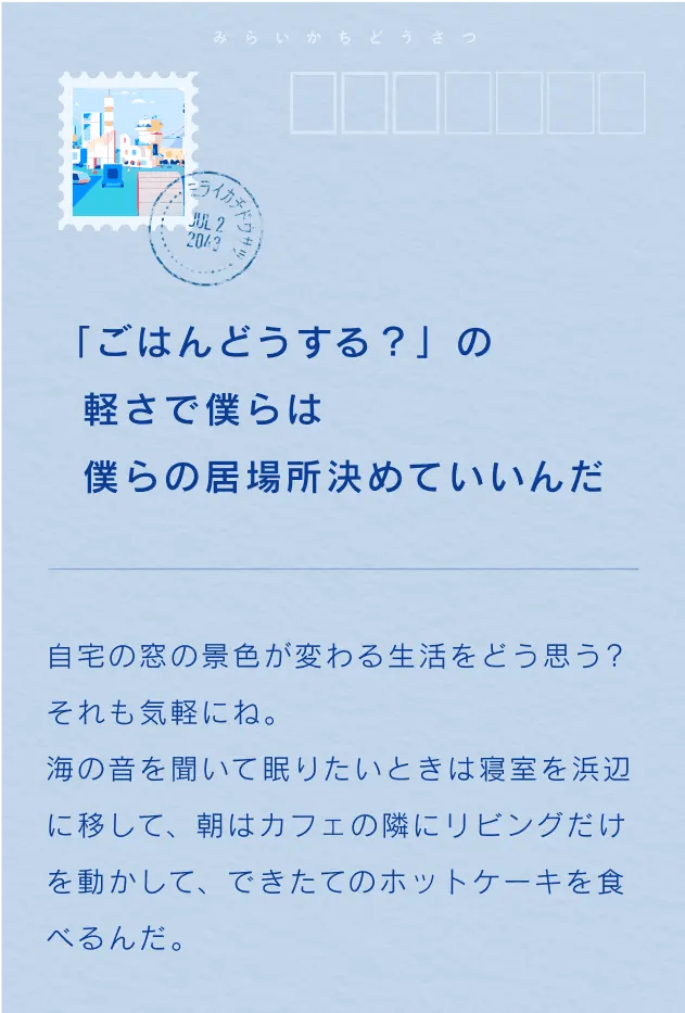 生活空間を自由自在にセパレートしたりドッキングしたりすることで、暮らし方や働き方の場所の制約が無くなる。