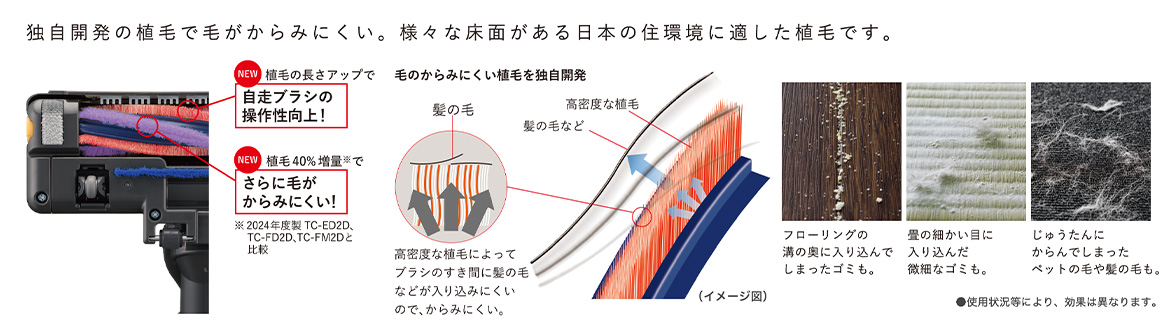 様々な床面のゴミもしっかり吸い取る2種類の植毛