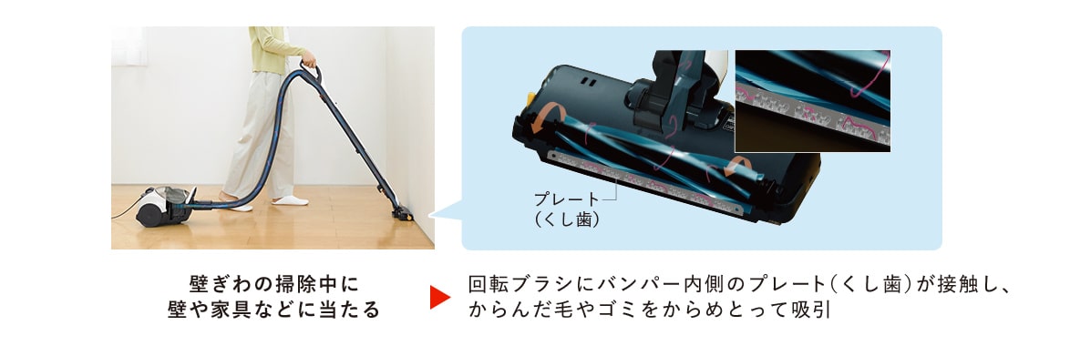 ブラシが壁に密着して壁ぎわのゴミもしっかり吸い込みます。