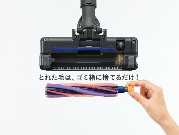 吸引力の低下につながる毛のからみも、回転ブラシをサッと引き抜くだけで簡単除去。お手入れのわずらわしさを軽減します。
