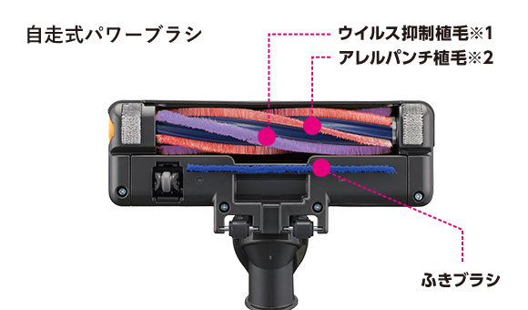 植毛に、ウイルス抑制加工(紫色)とアレルパンチ加工(赤色)を採用。清潔を保ちながらお掃除をすることができ、回転ブラシをお手入れする際も安心です。