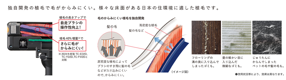 掻き出し植毛と拭き植毛の2種類の植毛を採用して、じゅうたん・畳・フローリングどこでもしっかりと吸い取れる日本家屋に適したブラシ。