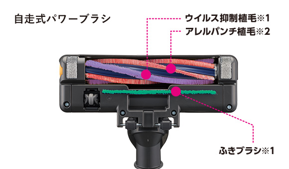 植毛に、ウイルス抑制加工(紫色)とアレルパンチ加工(赤色)を採用。清潔を保ちながらお掃除をすることができ、回転ブラシをお手入れする際も安心です。ふきブラシにもウイルス抑制加工を追加し、より清潔性がアップしています。
