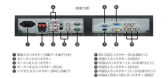 | アナログ | コンポジットビデオ<BNC>、S端子、コンポーネントビデオ<BNC×3(Y・Pb・Pr)>(PC/ビデオ共通) | ||