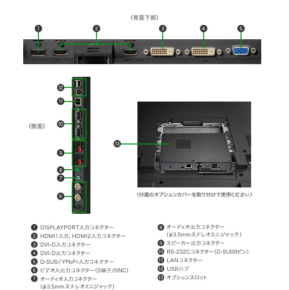 | PC入出力 | PC入力コネクター | デジタル | HDMI×2(PC/ビデオ共通)、DVI-D(HDCP対応※3、PC/ビデオ共通)、DisplayPort |