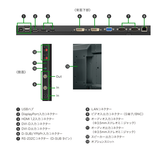 | PC入出力 | PC入力コネクター | デジタル | HDMI×2(PC/ビデオ共通)、DVI-D(HDCP対応※2、PC/ビデオ共通)、DisplayPort※4 |