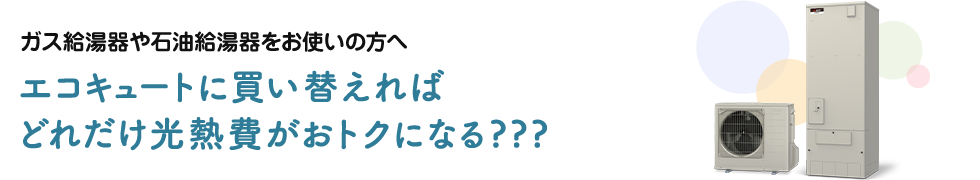 自然冷媒CO2ヒートポンプ給湯機 選択してください 2人 3人 4人 5人 6人 7人 選択してください 北海道電力 東北電力(寒冷地) 東北電力 東京電力エナジーパートナー 北陸電力 中部電力ミライズ 関西電力 中国電力 四国電力 九州電力 沖縄電力 選択してください 従来型ガス給湯器(LPガス) 従来型ガス給湯器(都市ガス) エコジョーズ(LPガス) エコジョーズ(都市ガス) 石油給湯器(灯油) 年間約00,000円おトク! 年間約00,000円 年間約00,000円 エコキュート 今お使いの給湯器(エコジョーズ(都市ガス)) 試算条件 ※ テキスト ※ テキスト エコキュートなら、給湯に使う電力消費量が約1/3に 詳しくはこちら > 他熱源から三菱 エコキュートに替えた場合、光熱費がどれだけ安くなるかを試算するソフトです。