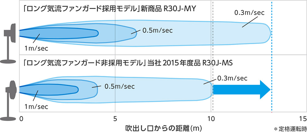 風速アップ効果のあるロング気流ファンガード採用で、より到達距離の長い風を実現。お部屋の空気をいっそう効率よく循環できるので、ぜひ夏冬の冷暖房効率の向上にかしこくお役立てください。