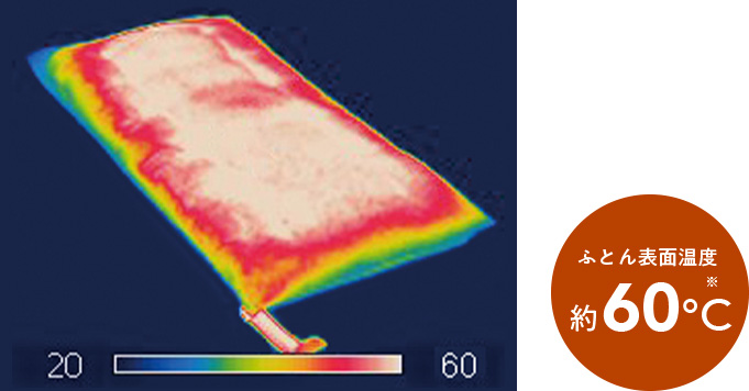 ※当社試験データ。シングルふとん、室温20℃の場合。あたたまりイメージは、運転時間経過直後に掛ふとんを外した状態で撮影したものです。