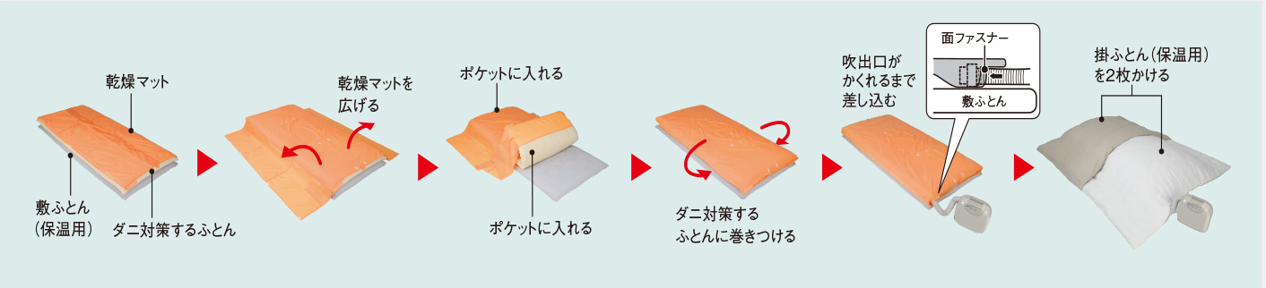 ダニの活動を抑制すると言われている約50℃以上の温風で、ふとんのダニ対策をします。