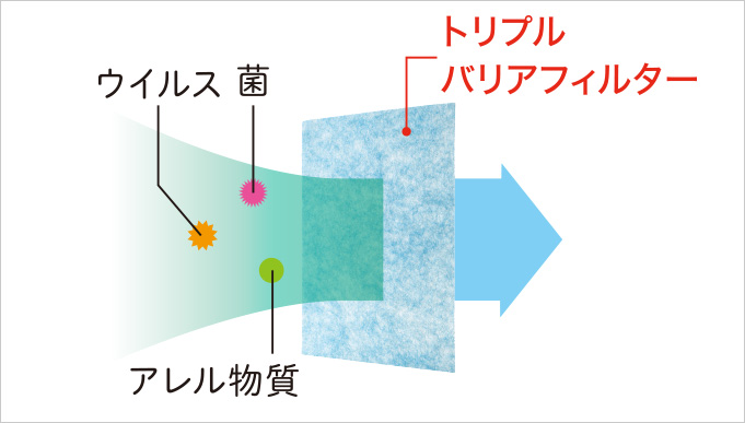 毎日肌に触れるふとんを清潔に乾燥し、快眠をサポートします。〈トリプルバリアフィルターとはレーヨン繊維に人工酵素(抗アレルゲン・抗菌・ウイルス抑制)を化学的に固定したフィルターです。実使用環境下での効果とは異なります。また、タバコの煙や、煙に含まれる有害物質の一酸化炭素などは除去できません。〉