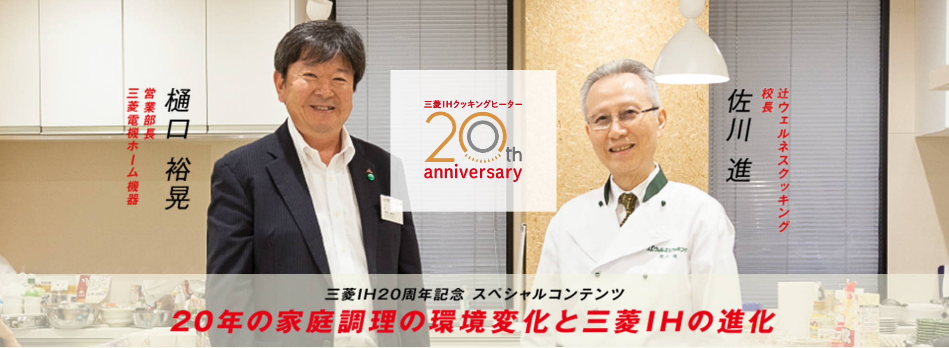 この数十年間、日本の「食」は大きく変わりました。食卓の光景、家庭料理の作り方に調理器具。今回は、日本のIHクッキングヒーターの先駆者である三菱電機ホーム機器の樋口裕晃営業部長と、100年に渡り「家庭の味」の心と業を伝える伝承者である辻ウェルネスクッキングの佐川進校長に、ここ20年で変化した家庭での調理環境と三菱IHの進化について語り合っていただきました。