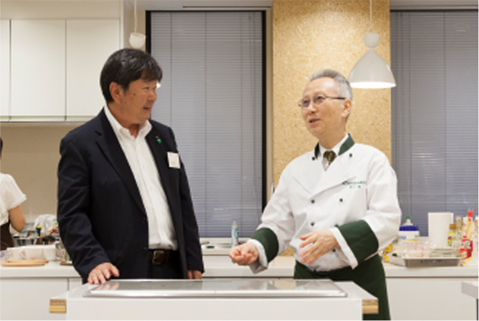 - その頃、自宅のキッチンを改装することになり、業者さんがおすすめしてくださったとか。それからは、辻ウェルネスクッキングでも各校で三菱電機さんのIHクッキングヒーターを採用させていただいています。ちなみに相談役の自宅のIHクッキングヒーターは導入以来、一度の故障もなく19年間使わせて頂き、昨年秋、再度キッチンを全面改装。今回も最新型の「びっくリングIH」に交換したと聞いています。