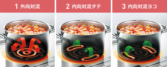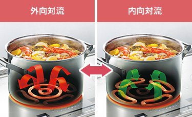 対流が切り替わることで、コトコト煮込むブイヤベースやカレーは焦げつきを抑え、長時間牛すね肉を煮込む料理では、煮くずれを抑えます。