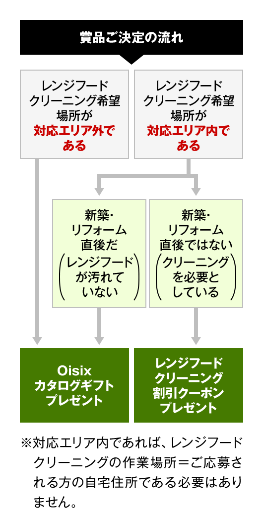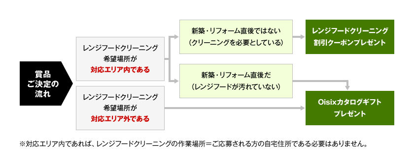 - ●プレゼントがレンジフードクリーニング1万円(税込)割引クーポンになるか、Oisixカタログギフトになるかは下記の流れをご参照ください。