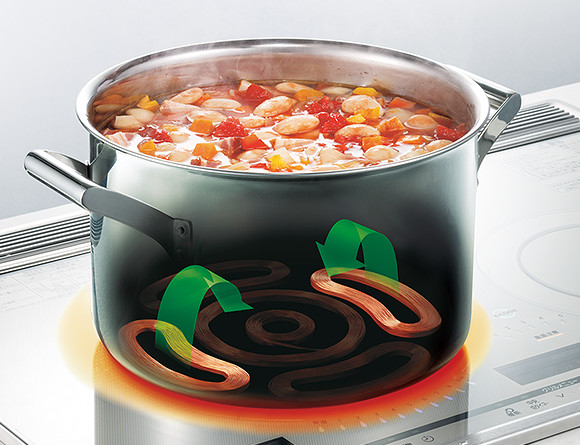 三菱IH独自※1の〈びっくリングコイルP〉が、鍋底を分割で加熱。分割エリアごとに制御できるから、自動で加熱と停止を繰り返し、最適なかき混ぜ効果のある交互対流※2をおこします。だから具材の一つ一つまで旨味をしみ込ませながら、煮くずれや焦げつきを抑制。カレーも焦げつきにくいから、かき混ぜる手間なく調理いただけます。また、長時間かかる本格的な煮込み料理も、ご家庭でカンタンに。