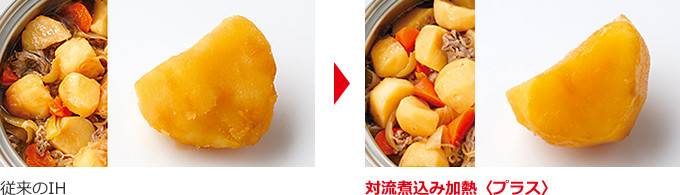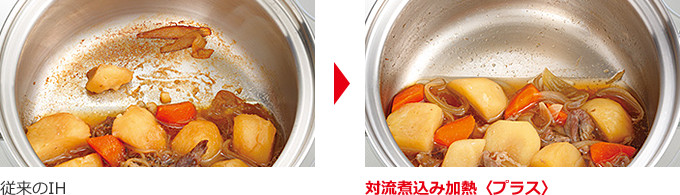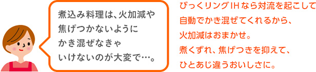 自動でかき混ぜ、おいしさがしみわたる「対流煮込み加熱〈プラス〉」