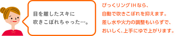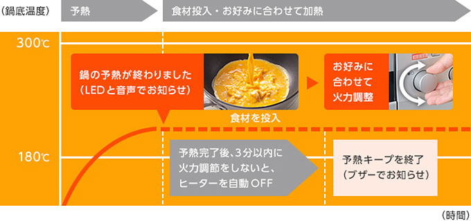 従来のIHでは難しかった、鍋肌部分の加熱が〈びっくリングコイルP〉で可能になりました。外側コイルを8割、内側コイルを2割という、炒め物、焼き物に適した火力配分にして、鍋肌まで上手な加熱が実現。鍋のサイズにこだわらず鍋底から鍋肌までより均一にしっかり加熱し、炒飯もパラリと上手に仕上がります。予熱温度は約160℃、約190℃、約220℃から簡単選択。食材投入のタイミングはLEDと音声でお知らせします。