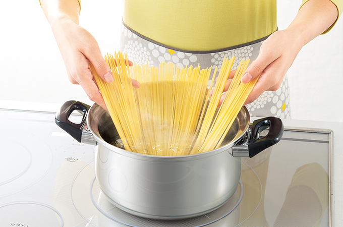 鍋のお湯がひと煮立ちしたら、メニューから「ゆでもの」を選ぶだけ。沸騰をキープしながら、吹きこぼれを抑えます。外向き対流と内向き対流を自動でおこす交互対流※2ならではのムラのない加熱で、おいしく、上手にゆで上げます。吹きこぼれやすいめん類や、ゆでムラの出やすい野菜も、おまかせ。