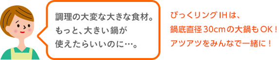 三菱IH独自※1の〈びっくリングコイルP〉なら、鍋底の直径が30cmの大鍋でも調理が可能。大きな鍋底も、ムラを抑えてすみずみまで加熱します。煮込み料理のまとめづくりや、大人数分の焼き餃子、丸ごとの煮魚も大得意!家族みんなのぶんを一気に仕上げられるから、笑顔が広がります。今よりもっとおいしく楽しく、大鍋料理をご家庭で。